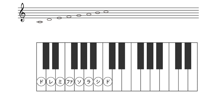 運指:1指(親指)からドレミを1指→2指→3指の順に弾き、1指が3指の下をくぐってファソラシドを1指→2指→3指→4指→5指の順で弾く。