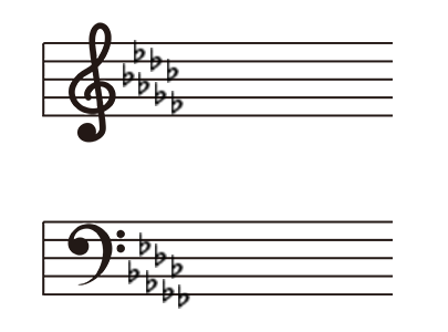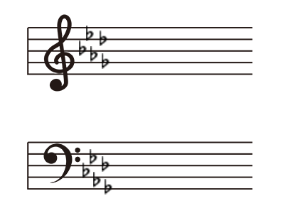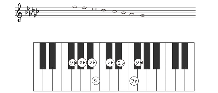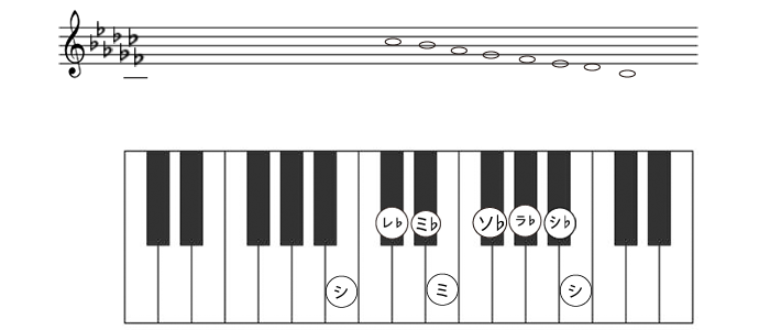 調号:♭が5個、「シ」、「ミ」、「ラ」、「レ」、「ソ」、「ド」、「ファ」に付く。