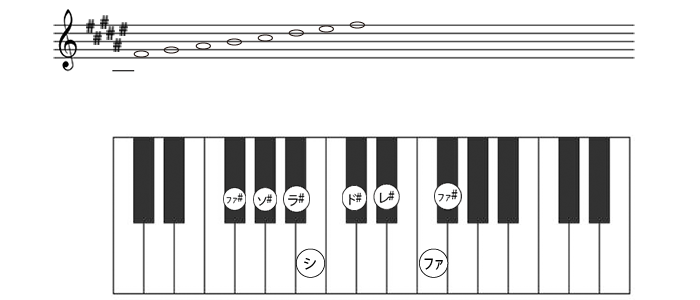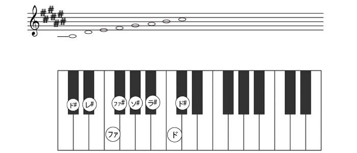 調号:#が6個、「ファ」、「ド」、「ソ」、「レ」、「ラ」、「ミ」に付く。
