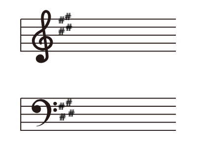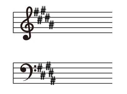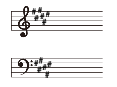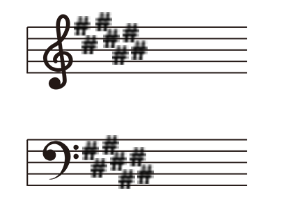 調号:#が4個、「ファ」、「ド」、「ソ」、「レ」に付く。