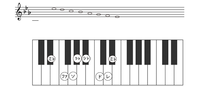 音階:ミの♭から始まるドシラ(♭音階なので、下降ルートで表してみる)。