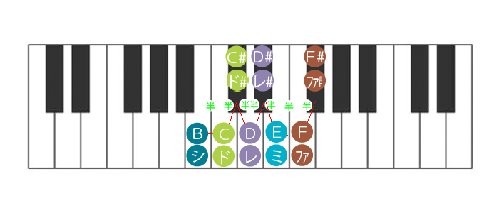左図のように、KEYが長調のBの場合、Bを基準に、C→C#→D→D#→E→F→F#という風に、七音右に移動すると完全五度上のF#になる。よって五度圏早見表の外円Bのすぐ下はF#