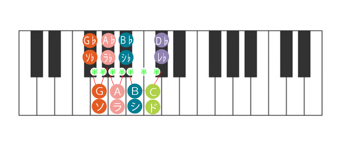 左図のように、KEYが長調のD♭の場合、D♭を基準に、C→B→B♭→A→A♭→G→G♭という風に、七音左に移動すると完全五度下のG♭になる。