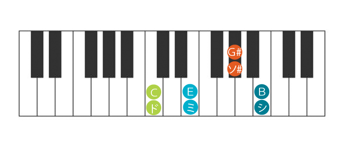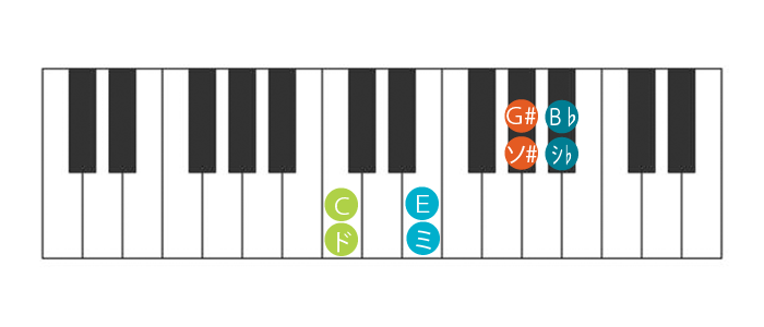 Caug7:増三和音(オーギュメント トライアド)に短7度の音を加えた和音。