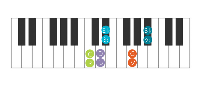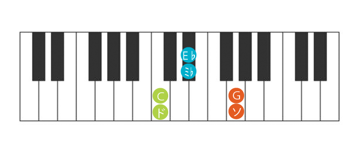 Cm:根音から短3度、完全5度を加えた和音。長三和音(メジャー トライアド)の第3音を半音下げ、短3度とした和音。