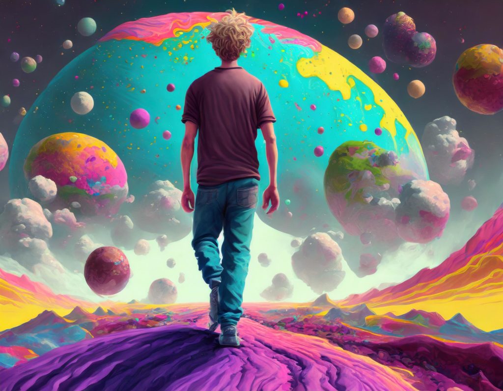 プロンプト:カラフルなチョコレートでできた惑星を歩く人